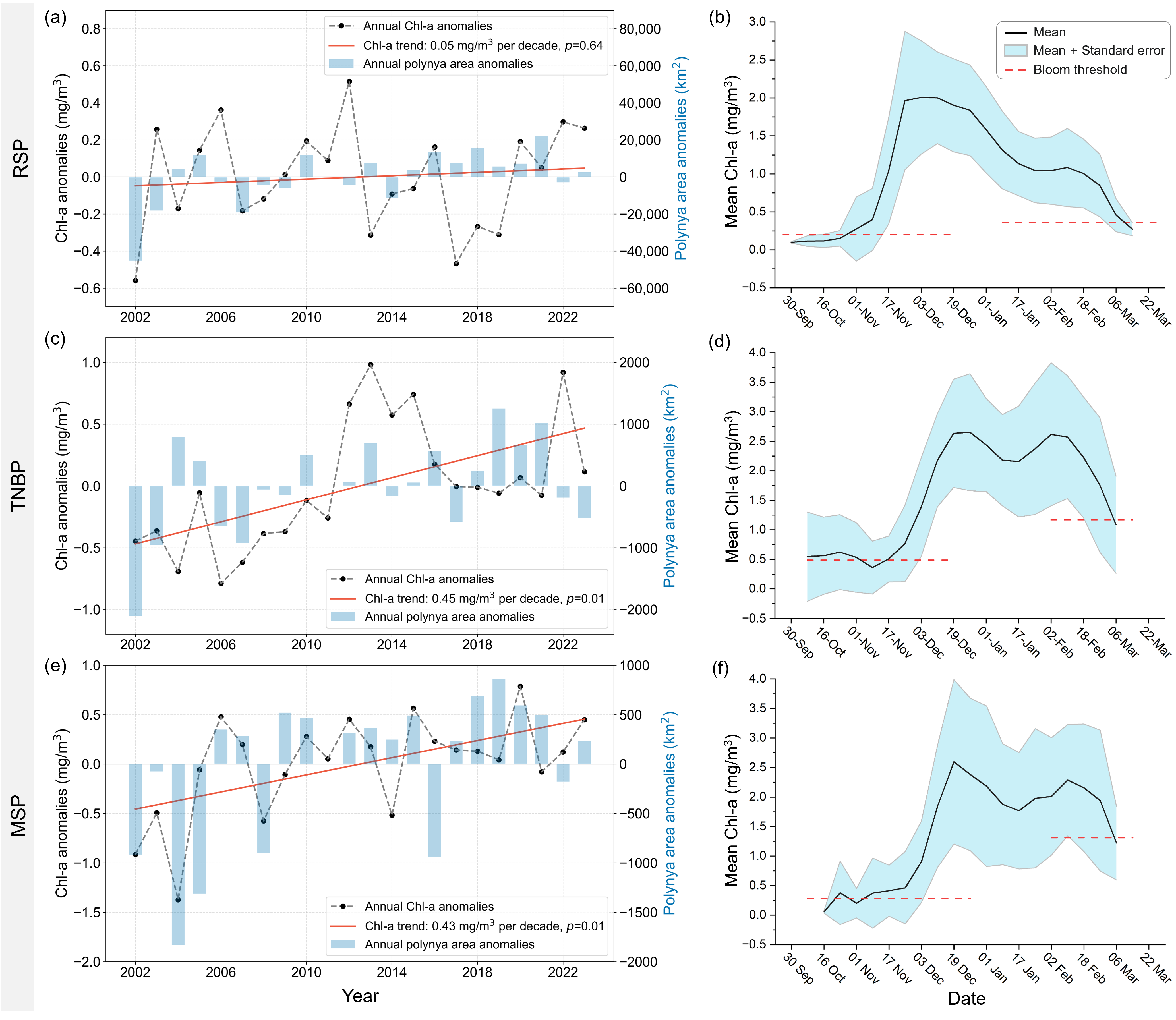 图2 2002–2023年三个冰间湖的Chl-a异常值(a, c, e)与冰间湖面积异常值,以及Chl-a的年际气候平均态(b, d, f)。