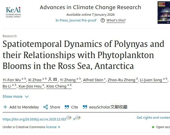 该研究于2026年1月在中科院一区Top期刊《Advances in Climate Change Research》上发表,题为“Spatiotemporal Dynamics of Polynyas and their Relationships with Phytoplankton Blooms in the Ross Sea, Antarctica”。老太阳集团tcy8722网站太阳网集团tcy8722极地与海洋遥感团队博士研究生吴怡凡为第一作者,赵羲副教授为通讯作者,硕士研究生张翼、荷兰ITC Alfred Stein教授、上海交通大学张召儒教授、博士研究生宋利娟、李博、老太阳集团tcy8722网站程晓教授和侯雪姣副教授为文章的合作作者。本研究受国家自然科学基金项目(42476257)和教育部学科突破先导项目(JYB2025XDXM803)的支持。