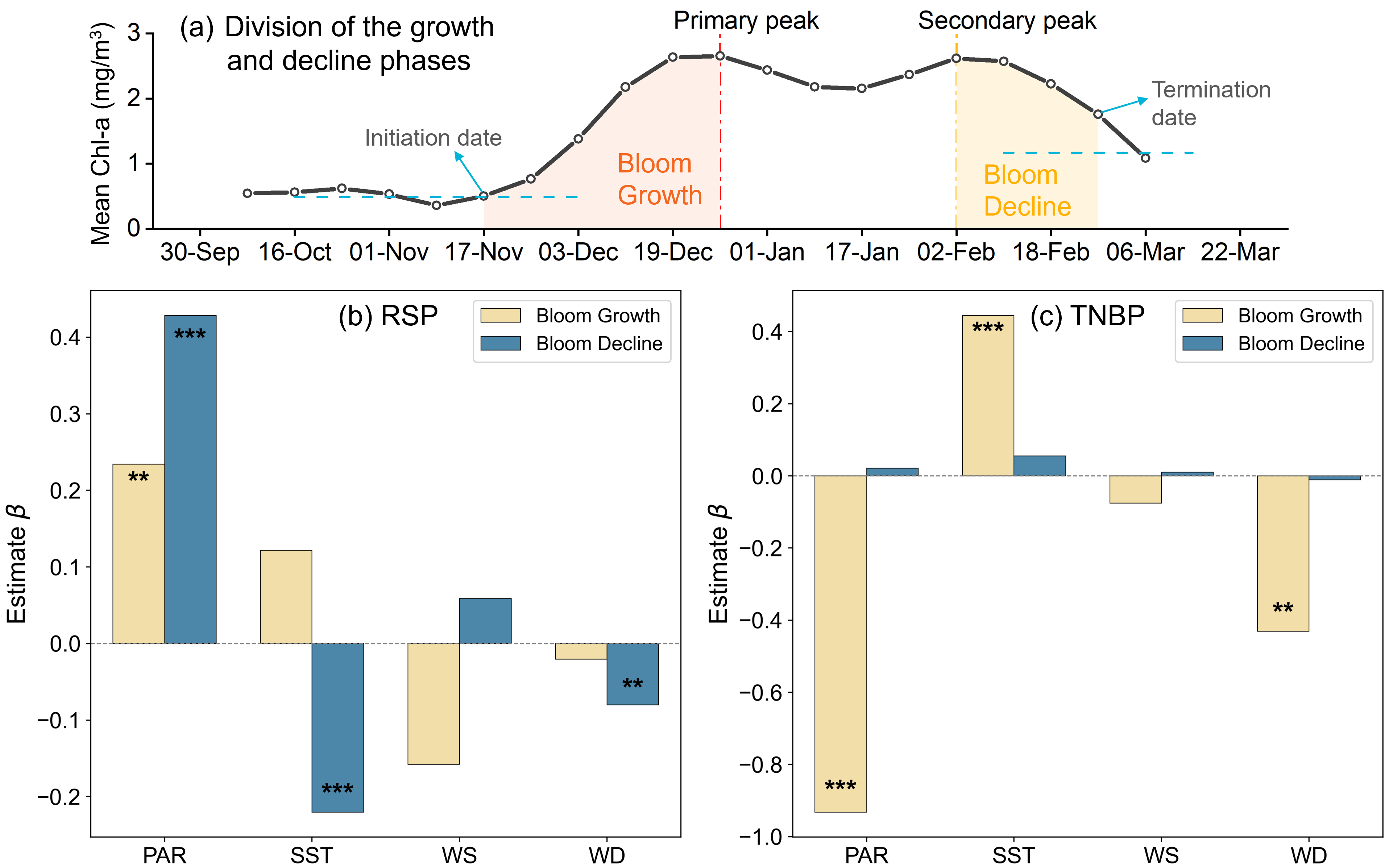 浮游植物大量繁殖是一个过程(图2bdf),冰间湖可能更容易影响“开始时间”,但峰值和结束时间则往往受到其他环境因子共同控制。为此研究进一步把繁殖过程划分为生长和衰退两个阶段,并利用多元回归分析光照、海表温度和风场等因子的阶段性作用差异(图4)。
