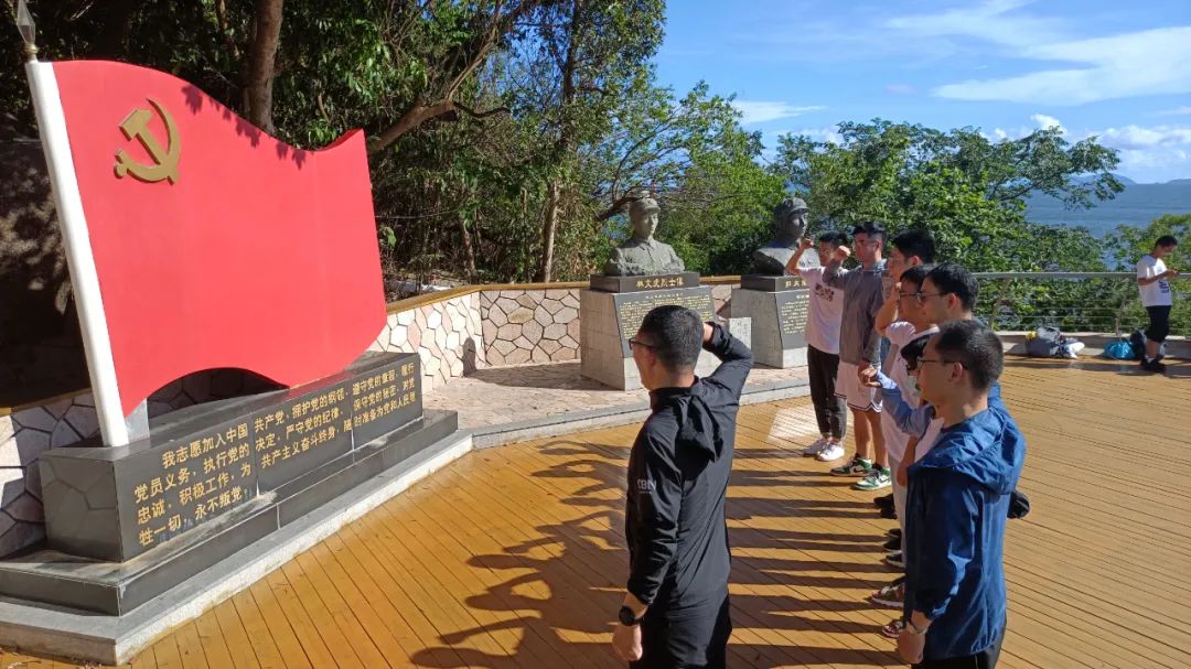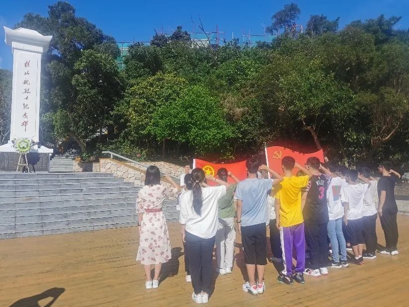 登上桂山岛,师生瞻仰“桂山号”英雄登陆点、万山海战战斗遗址和烈士陵园,感悟当年人民海军以弱胜强,以少胜多,创造军事史上奇迹的历史。1950年5月25日,万山群岛解放战役中,桂山舰登陆垃圾尾岛,在密集的炮火中断为两截,舰上200多人几无生还。战士们的英勇战斗为后继部队的最后胜利开辟了道路,被赞扬为“人民海军首次英勇战例”。为纪念英雄功绩,垃圾尾岛从此更名为桂山岛。现场一块块展示牌,一组组数字、一个个名字,展现着万山海战的壮烈战事和先烈们的壮举;回顾那段历史,先辈们军民一心、克服艰险、英勇战斗、不怕牺牲的革命精神,深深感动和激励了在场每一个人。大家在桂山舰战士纪念碑下怀着对先烈的敬仰,怀着对党的忠诚,重温入党誓词与入团誓词。