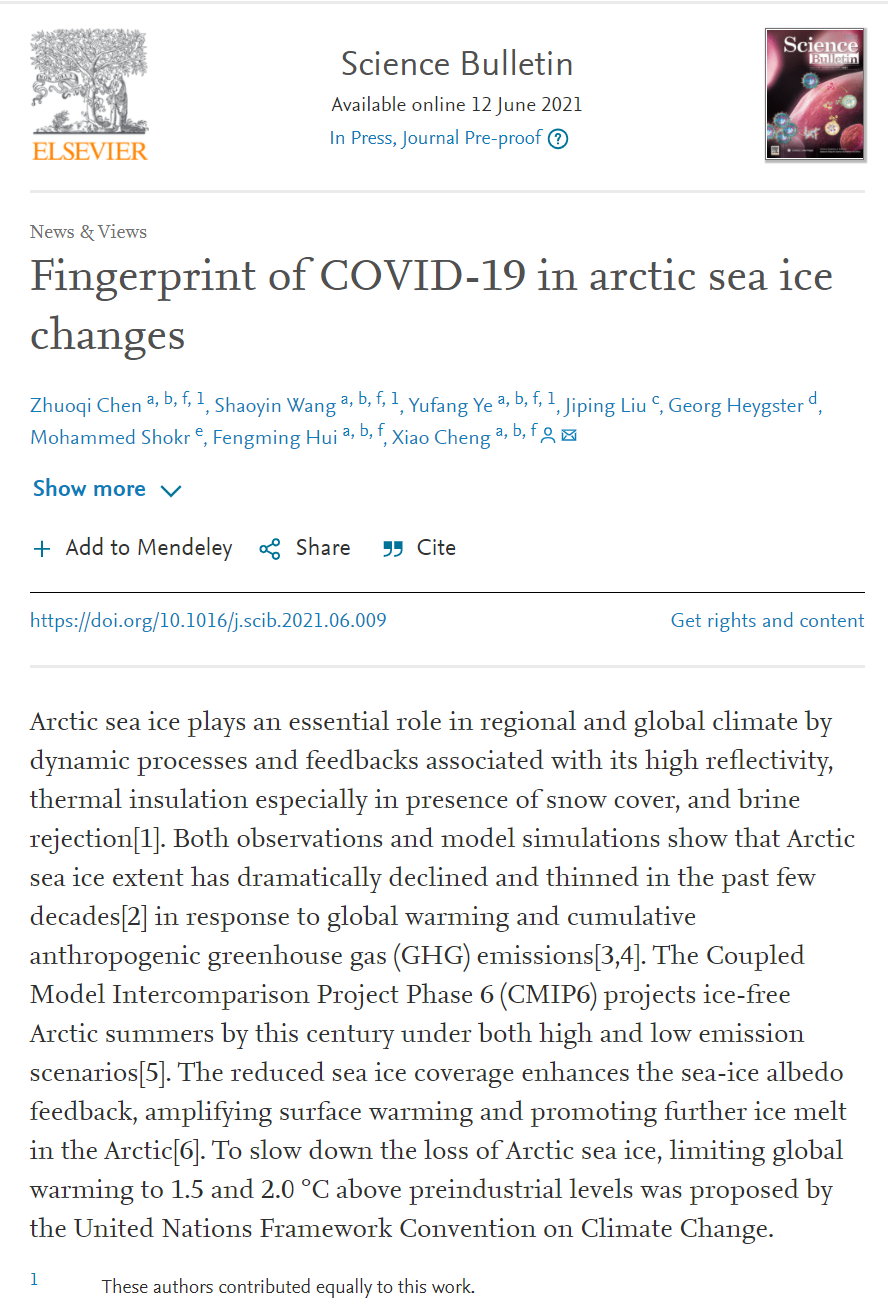 老太阳集团tcy8722网站测绘科学与技术学院极地与海洋遥感团队于2021年6月在国际著名期刊Science Bulletin发表论文,题为“Fingerprint of COVID-19 in Arctic sea ice changes”。陈卓奇副教授、王绍银博士和叶玉芳助理教授为该文章的第一作者,程晓教授为该文章的通讯作者,惠凤鸣教授为该文章的合作作者。该研究得到了国家重点研发计划项目(2019YFC1509104)、国家自然科学基金杰出青年基金项目(41925027)、南方海洋实验室创新团队等的支持。