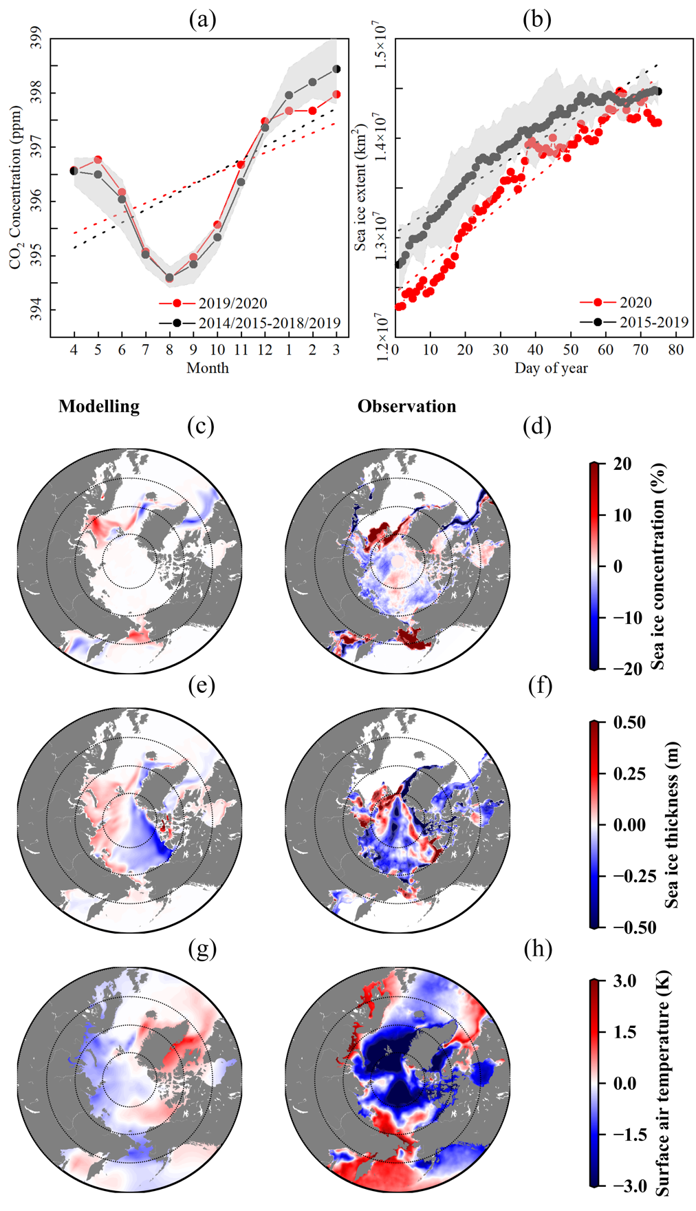 图 1. 观测的全球平均二氧化碳浓度、海冰密集度、海冰厚度和表面气温异常以及模拟的海冰密集度、海冰厚度和表面气温异常。(a)2019年4月至2020年3月的全球月平均大气二氧化碳浓度(红线)和前五年的平均(黑线);(b)2020年1月至3月的逐日的北极海冰范围(红线)和前五年平均(黑线)。(a)和(b)中的黑色和红色直线是线性拟合,灰色阴影是前五年的1倍标准差。(c)、(e)和(g)表示模拟的海冰密集度、厚度和表面气温异常。(d)和(f)表示卫星观测的海冰密集度和海冰厚度异常。(h)是基于再分析的资料的表面气温异常。模拟的3月份异常是REDUCTION和NORMAL试验100年平均的差异;2020年3月的观测异常是相对于前五年的。
