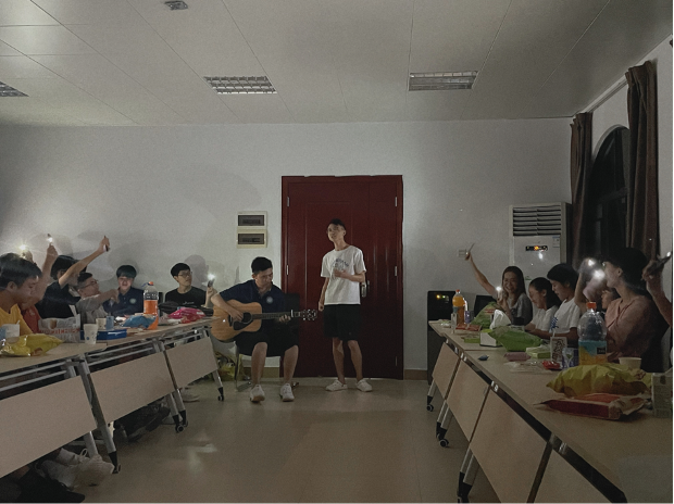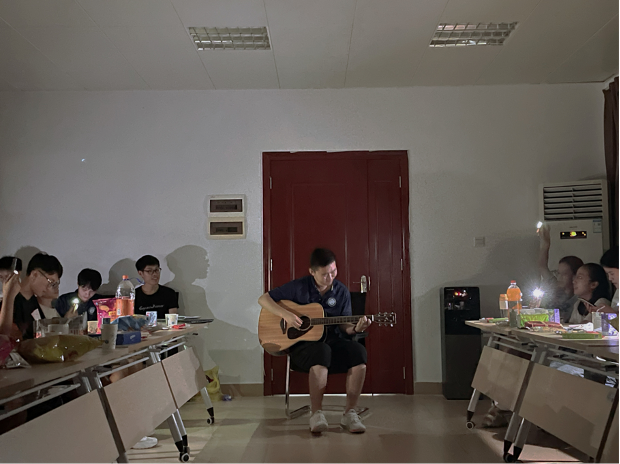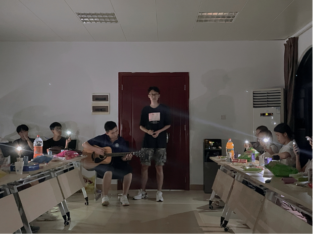 文艺能人们纷纷上台表演,杨天同学一曲《月光下的凤尾竹》作为开场,张岭峰、张帅、冯雪洁和刘鹏宇同学分别带来了《成都》、《晴天》、《Love Story》和《稻香》。郭丁昊同学为大家用吉他伴奏并带来了一首《七里香》。同学们纷纷拿出手机打开手电筒一起合唱,为我们的舞台点亮了点点星光。