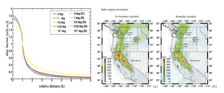 7. GNSS水文学新领域。基于负荷形变理论和空间约束反演模型,利用GNSS垂直位移实现区域水储量变化高精度反演。该方法已在美国西海岸区域进行应用,对空间约束的区域边界水储量的估算精度提高了10~20%。