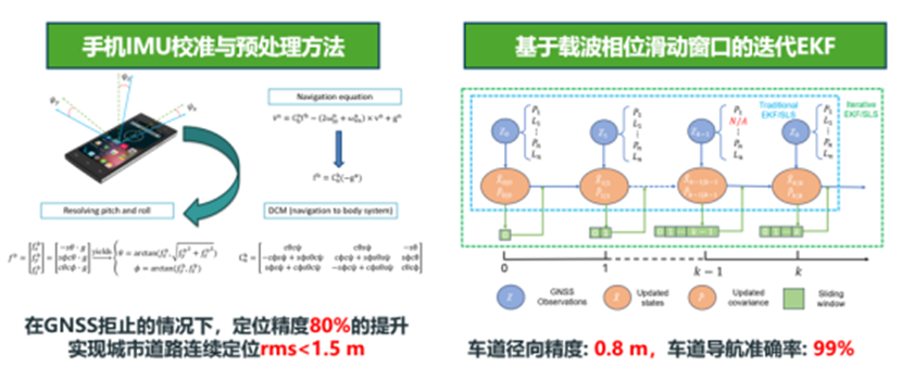 10. 针对智能手机在城市峡谷环境中的导航问题,利用手机自身的GNSS与IMU观测数据,设计了面向IMU原始数据的预处理方法,在城市峡谷与短隧道等复杂场景下显著提升了GNSS/IMU紧组合导航精度。在此基础上,研发了结合自适应扩展卡尔曼滤波(AEKF)的PPP增强算法(Enhanced PPP),相较传统PPP方法,定位精度提升超过46%。同时,提出了一种基于载波相位历史信息的滑动窗口迭代卡尔曼滤波(IEKF)方法,有效提升了周跳探测成功率达65%以上。综合多源观测与算法优化,在真实城市道路环境中实现了实时亚米级车道定位精度(约0.8米),车道导航准确率达到99%。